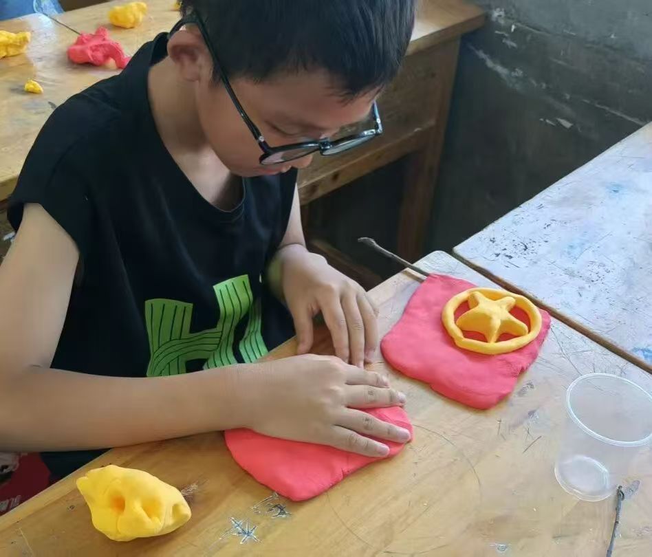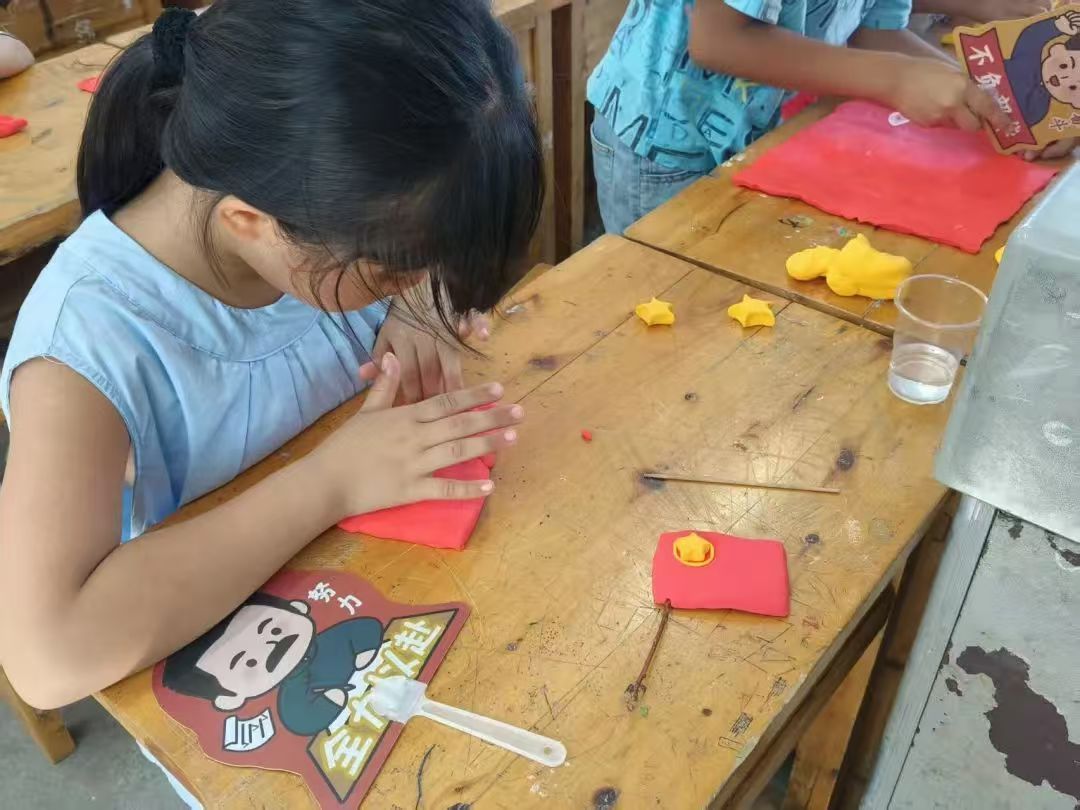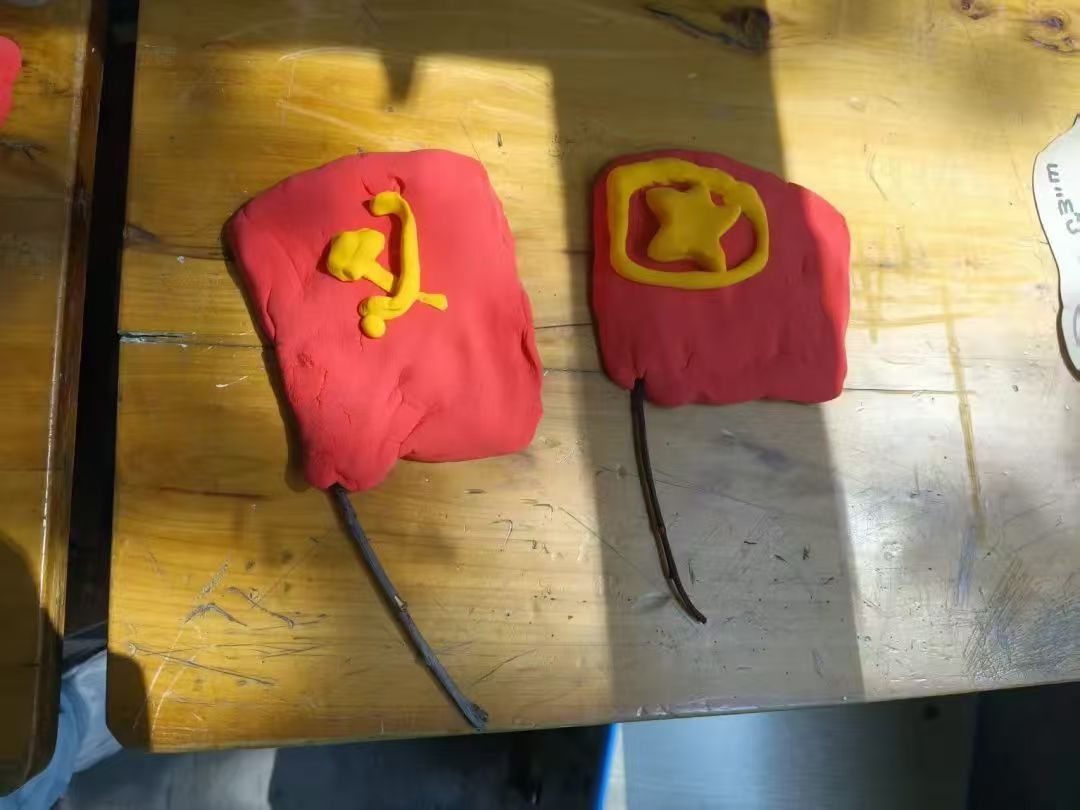 为深化理解,服务队带领小朋友们进行超轻黏土实践,指导孩子们亲手制作党旗、团旗、国旗。指尖摩挲间,红色旗帜的意义悄然扎根,爱国情、强国志在童真心中萌芽。