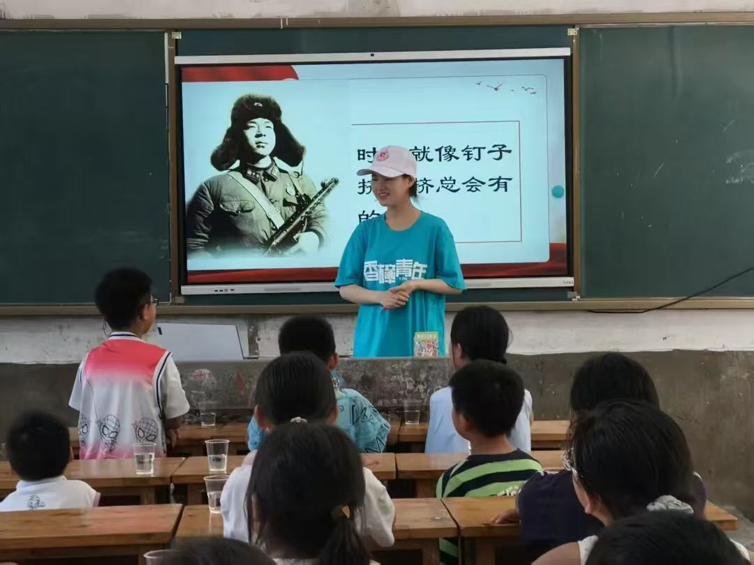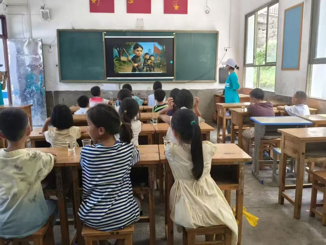 活动中,服务队成员周健英以 “人民的勤务员” 雷锋、“生的伟大,死的光荣” 刘胡兰等英雄事迹为切入点,通过 PPT 讲解、动画观影,生动讲述共产党人的精神谱系。课堂里,孩子们聚精会神,在聆听与互动中感悟先辈担当。