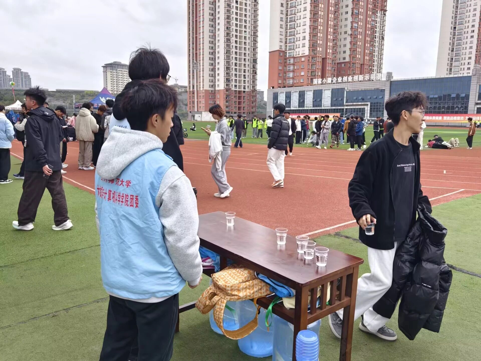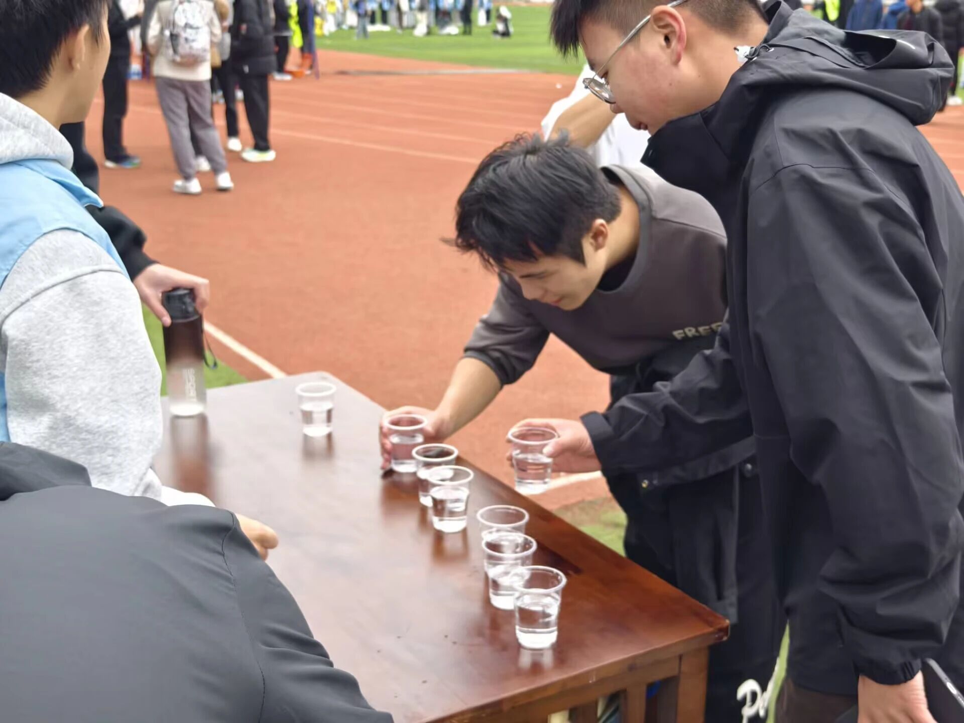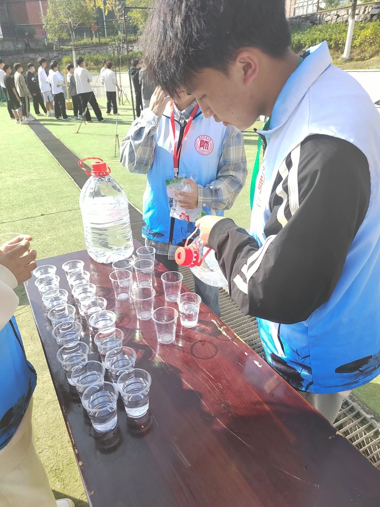 刚结束长跑的同学接过温水时