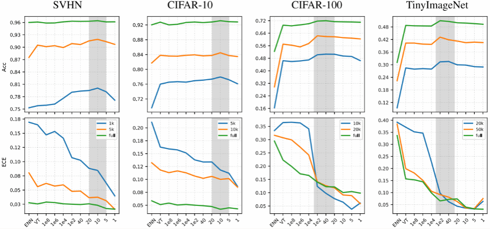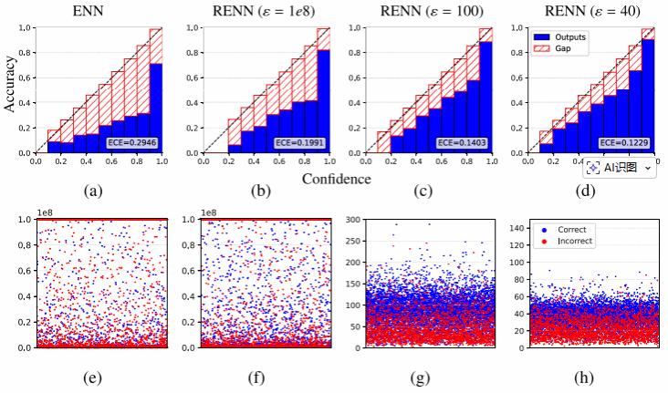 论文结果表明,ENN 仍可能出现严重过度自信并伴随泛化退化,且在主动学习等低标注数据场景中尤为突出。更重要的是,本研究揭示了一个反直觉但关键的结论:在训练分类模型时,传统做法(包括ENN)往往持续“最大化对正确类别的支持”,而这种看似合理的训练逻辑,反而可能是诱发过度自信的重要根源。实验进一步验证,即便将正确类别的支持强度压到很小的水平,模型依然能够被有效训练;当把这种支持强度约束在一个适度范围内时,模型的校准性与泛化能力均可显著提升。