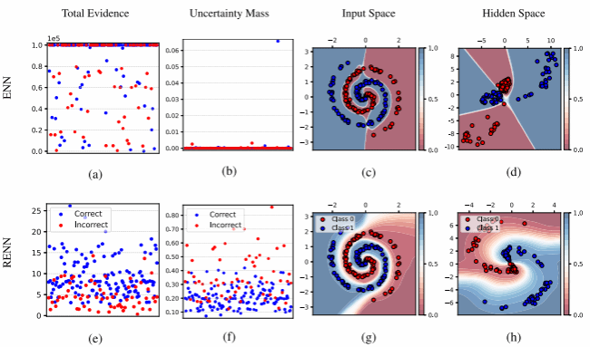 基于上述发现,本研究提出正则化证据神经网络(Regularized Evidential Neural Networks, RENN):以“Dirichlet–Dirichlet 的 KL 距离”替代 ENN 原有“拟合项+ 收缩项”的两阶段目标,并引入超参数显式约束正确类别证据的“适度范围”,从而将“对正确类别的适度支持”转化为可控、可调的学习约束。合成数据与真实数据的可视化结果进一步表明:相较于 ENN 中证据值易出现过大且分布混乱、不确定性质量趋于塌缩的现象,RENN 能将总体证据压缩到可控区间,使正确/错误样本的证据分布更加可分,进而形成更合理的不确定性结构;在输入空间与特征空间中,模型呈现出更平滑、更符合直觉的决策边界与低置信区域,并带来更优的校准与泛化表现。