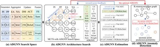 针对上述行业难题,团队创新性提出属性解耦的图神经网络架构搜索方法 ADGNAS,构建了全新的属性解耦图神经网络建模范式,首次实现边与节点属性在不同K近邻图拓扑下的解耦聚合,同时设计了适配的蒙特卡洛树搜索算法,可根据数据分布差异自适应构建最优网络模型。多组基准实验显示,该方法在检测性能上全面超越现有主流算法,搜索效率较传统自适应图学习方法最高提升50倍。