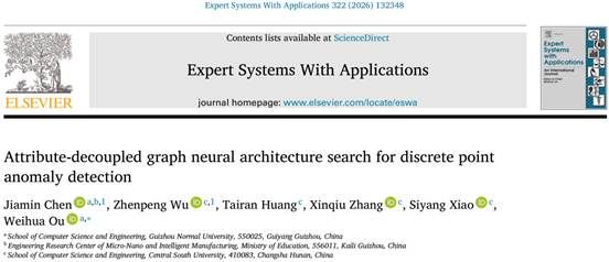 近日,贵州师范大学大数据与计算机科学学院欧卫华教授团队下的DeepGraph课题组在人工智能离散点异常检测领域取得重要研究进展,相关成果以《Attribute-decoupled graph neural architecture search for discrete point anomaly detection》为题,发表于国际权威期刊《Expert Systems With Applications》(IF=7.5)。该期刊为工程技术领域中科院一区 TOP 期刊,是人工智能与专家系统领域的国际顶刊。