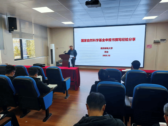 为扎实推进 2026 年度国家自然科学基金项目申报工作,提升学院教师申报书撰写质量,2025年12月9日,我院特邀南京邮电大学周全教授,举办基金申报书撰写经验分享报告会。学院拟申报国基教师参会,报告会由院长欧卫华教授主持,现场学习氛围浓厚。