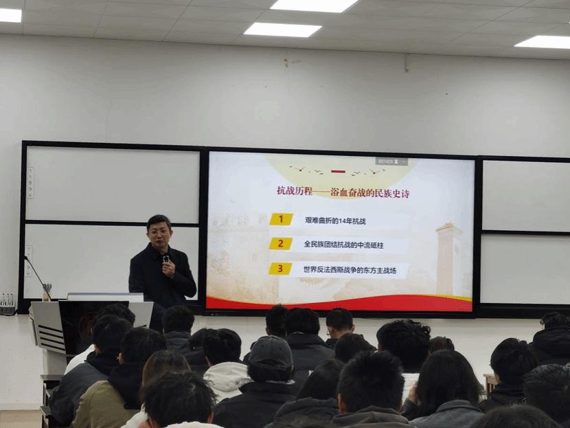黄其松围绕“浴血奋战的民族史诗”“贵州篇章,群山中的抗战烽火”及“青年使命,精神接力的时代篇章”三个方面,深入浅出地为同学们解读了中国人民抗日战争的伟大胜利的历史和现实意义。带领同学们回顾了八十年前,中华民族在生死存亡关头,如何在中国共产党倡导建立的抗日民族统一战线旗帜下,万众一心、共御外侮的壮阔历史画卷。他通过翔实的历史资料、生动的英雄事迹,系统阐述了中国人民抗日战争的艰苦历程、重大意义和深远影响,强调了这是近代以来中国反抗外敌入侵第一次取得完全胜利的民族解放战争,开辟了中华民族伟大复兴的光明前景。